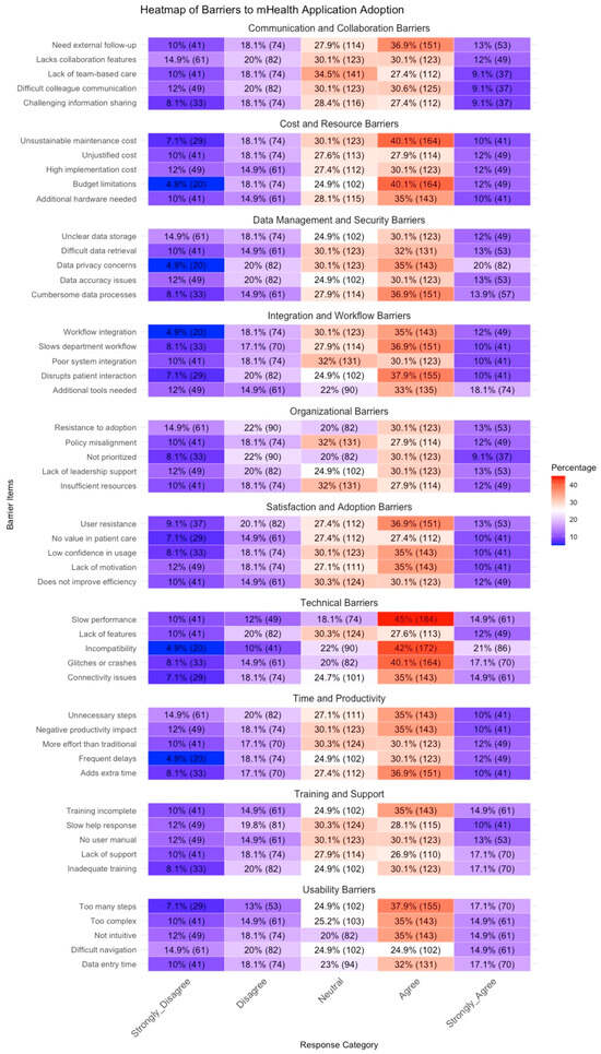 This study makes a significant contribution to the literature by shifting the focus from patient-centered mHealth adoption challenges to the barriers encountered by healthcare practitioners. While previous research has extensively examined patient experiences with mHealth applications, limited attention has been given to the perspectives of healthcare professionals who are integral to the successful implementation of these technologies. By empirically identifying and quantifying key barriers, including technical, usability, training, integration, security, organizational, and productivity-related constraints, this study provides a structured and comprehensive framework for understanding the complexities of mHealth adoption in clinical practice. The findings highlight that while digital literacy levels significantly influence practitioners’ perceptions of these barriers, demographic factors such as age, occupation, and work experience do not exhibit a strong impact. Additionally, the study’s heatmap analysis and statistical evaluations reveal that technical performance, usability challenges, and workflow integration issues are among the most critical obstacles affecting mHealth adoption, underscoring the need for targeted improvements in system functionality and user experience.