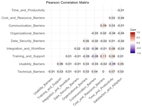 The Pearson correlation matrix presented in Figure 4 illustrates the interrelationships among the key barriers affecting the adoption and usability of mHealth applications. The visualization employs a correlation heatmap where the size and colour intensity of the circles denote the strength and direction of the relationships. Positive correlations are depicted in shades of red, while negative correlations appear in shades of blue, with stronger hues indicating higher correlation values. The correlation coefficients range from −1 (indicating a perfect negative relationship) to 1 (indicating a perfect positive relationship), whereas values near zero suggest minimal or no linear association between the variables.