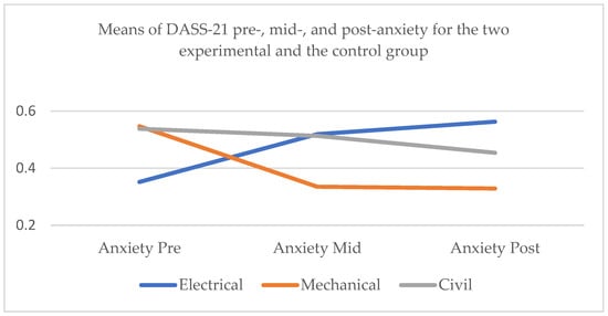 Means of DASS-21 pre-, mid-, and post-anxiety for the two experimental subgroups, the mechanical and civil engineers, and the control group, the electrical engineers.