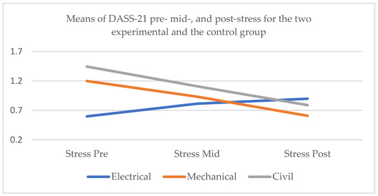 Means of DASS-21 pre- mid-, and post-stress for the two experimental subgroups, the mechanical and civil engineers, and the control group, the electrical engineers.