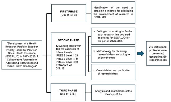 The working team, composed of professionals from various disciplines across the three levels of ESSALUD’s healthcare system, focused on identifying institutional issues within each of the twelve priority research topics of Peru’s Social Health Insurance. The process consisted of three phases, summarized in Figure 1.