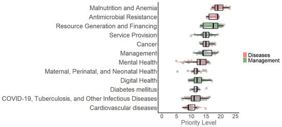 Distribution of priority levels across research topics in the ESSALUD portfolio. This figure presents a boxplot visualization of research topics categorized by priority level based on a comprehensive evaluation. Priority levels were determined using nine dimensions, including public health impact, feasibility, and innovation. Topics are divided into disease-related areas (orange) and management-related topics (green), emphasizing ESSALUD’s focus on areas such as cancer, mental health, and health service management. The boxplots provide insights into the distribution of scores, helping stakeholders prioritize research investments effectively.
