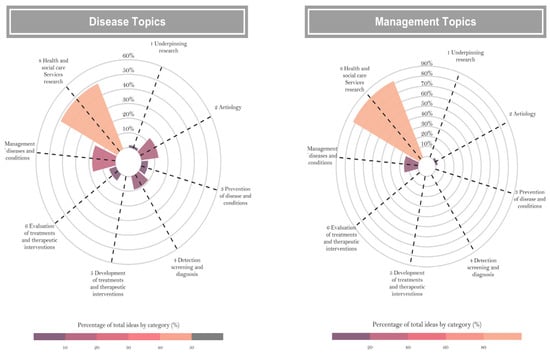 Activity group distribution for research ideas categorized by topic type. This radar chart compares the proportion of research ideas across different health research activities, as defined by the Health Research Classification System (HRCS). The left panel focuses on disease-related topics, showing a significant emphasis on health services and disease management research. The right panel highlights management-related topics, with health services research dominating the distribution. The charts provide a comprehensive overview of how research activities align with ESSALUD’s strategic goals for evidence-based improvements in public health and system management.
