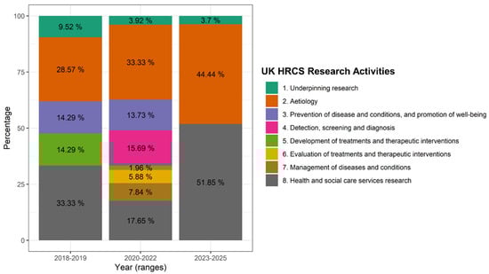 Trends in UK Health Research Classification System (HRCS) between 2018–2025. This stacked bar chart represents the percentage distribution of different Health and Care Research Activities (HCRS) across three time periods: 2018–2019 (before developing the Health Research Strategy), 2020–2022 (pandemics and developing of the Health Research Strategy), and 2023–2025 (after application of the Health Research Strategy). Each color corresponds to a specific research activity, as detailed in the legend on the right.
