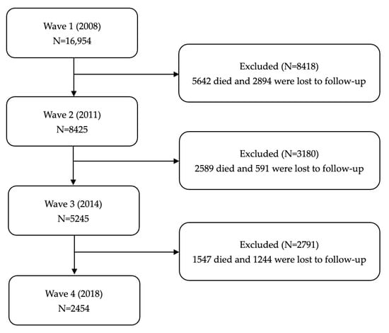 For the current study, we used data from the last four waves of datasets, including 2008, 2011, 2014, and 2018. Publicly available databases were downloaded from the CLHLS webpage (https://agingcenter.duke.edu/CLHLS, accessed on 1 March 2024). The analysis sample was restricted to older adults aged ≥ 60 years old at baseline in 2008 (n = 16,954). In addition, participants were excluded if they died, were lost to follow-up, or failed to report the assessment result of IC. Ultimately, a total of 2454 of the 2008 initial interviewees who were re-interviewed in 2018 were included. The flowchart of the analytic sample selection process is shown in Figure 1.