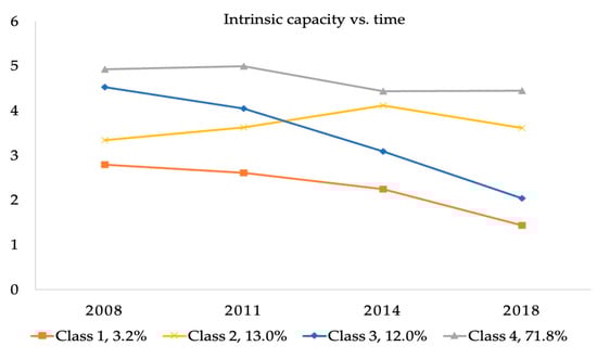 The concept of IC was first introduced in the World Report on Ageing and Health published by the World Health Organization (WHO) in 2015 [6], which identified IC as the combination of all physical and mental abilities that an individual may draw upon as they age. IC mainly includes five key domains: cognition, locomotion, sensory (including vision and hearing), vitality, and psychological [7]. To enable better application of IC, the integrated care for older people (ICOPE) screening tool was further proposed in a WHO handbook about guidelines on person-centered assessments and pathways in primary care in 2019, and the use of the ICOPE screening tool for the initial screening of older adults for IC was recommended [7,8]. The handbook covers six priority conditions of IC, namely, cognitive decline, limited mobility, malnutrition, visual impairment, hearing loss, and depressive symptoms. This tool provides an important reference for further in-depth assessment of the IC of older adults and targeted implementation of interventions. Aging is a dynamic developmental process [9]. Therefore, IC is a dynamic indicator that changes over time [3,10,11]. The WHO also showed in its world report on aging and health that in the process of aging, an individual’s level of IC will generally go through three stages: high and stable, decreasing, and significantly decreasing [6]. In addition, the IC of older adults will also decline before they experience adverse life events [6]. It can be seen that there is heterogeneity in the changes in the IC of older adults. Different developmental trajectories of IC may imply different causes of symptoms and have different effects on patient outcomes. Therefore, clarifying the developmental trajectories of IC in Chinese older adults is of great practical importance to improve the health outcomes of the older adults and thus promote their healthy aging. In recent years, while the number of studies on the IC of older adults has grown, most research still only describes a specific point in time, without long-term tracking or comparative analysis of changes in IC across different groups. Additionally, current research falls short in sample selection, data collection, and analytical methods, making it difficult to fully capture the complexity and dynamics of older adults’ IC.