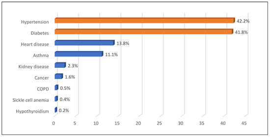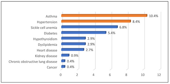 With respect to sedentary activities, 68.2% of employees watched television for fewer than three hours per day, and 71.5% slept fewer than eight hours a night. Eating habits showed that 58.5% of individuals consumed fast food one or two times a week, and 22.8% of the study participants never consumed fast food. Comorbidities were relatively low, and asthma (10.4%) and hypertension (8.4%) were the most common comorbidities found (Figure 1).