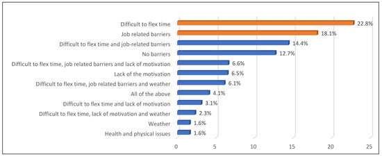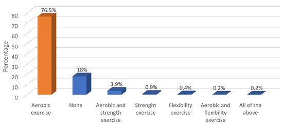 Figure 2 illustrates the family history of chronic diseases, revealing that hypertension (42.2%) and diabetes (41.8%) were the most common, while hypothyroidism (0.2%) was the least prevalent. Regarding barriers to exercise (Figure 3), the most commonly reported barriers were difficulty in flex time (22.8%) and job-related constraints (18.1%), while weather conditions and health or physical issues were the least common (both at 1.6%). Aerobics was the most frequently reported form of exercise among employees (76.5%) (Figure 4).