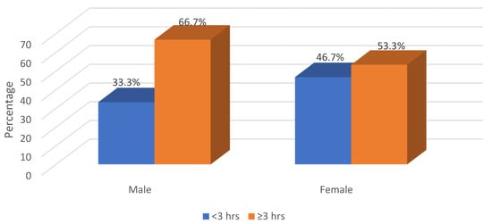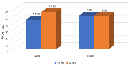 With regard to the overweight employees, we determined that those in the 41–50 age group spent more time (≥3 h) doing physical exercise per week (66.7%) than the other age groups, whereas slightly more in the youngest age group (43.8%) spent less time (<3 h) exercising per week (Figure 5). As shown in Figure 6, most of the obese males spend more than 3 h doing exercise per week (55.6%), while no difference in the frequency of exercise per week is seen among obese female employees. As shown in Figure 7, male overweight employees spend more time (≥3 h) doing exercise per week compared to obese females.