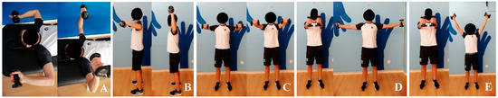 Illustration of the five exercises included in the weight program: (A) IR at 90°, (B) ER at 90°, (C) Scapular punches, (D) T’s, and (E) Y’s.