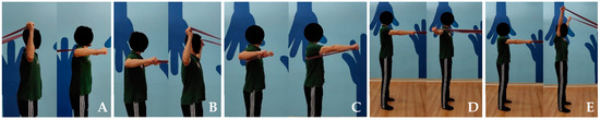 Illustration of the five exercises included in the elastic band program: (A) IR at 90°, (B) ER at 90°, (C) Scapular punches, (D) T’s, and (E) Y’s.