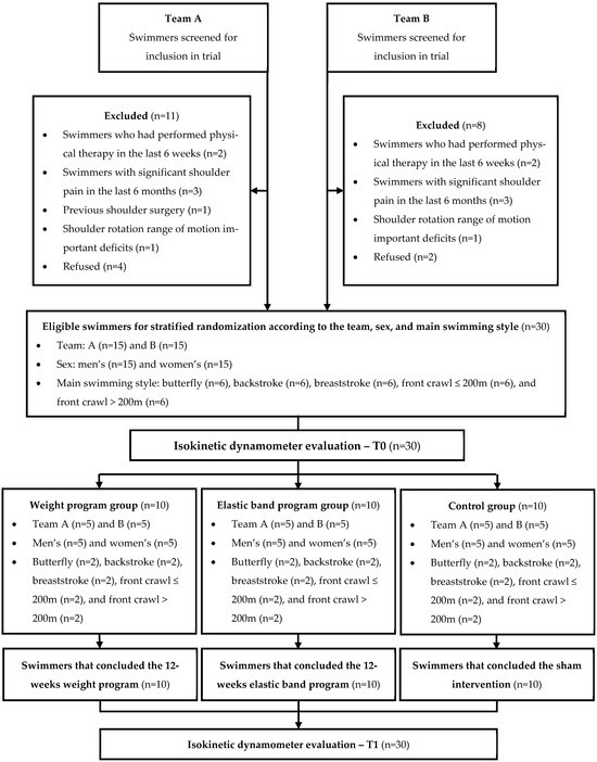 The initial contact with the competitive swimmers of the two swimming teams was made through a telephone call, during which the eligibility criteria and individual consent for participation in the trial were screened. The eligible swimmers were then divided into three groups: a weight program group, an elastic band program group, and a control group. Allocation to each group was performed through stratified randomization according to the team (A or B), sex (male or female), and main swimming style (butterfly, backstroke, breaststroke, front crawl ≤ 200 m, or front crawl > 200 m). This approach aimed to balance the potential effects of these three variables on the results [27]. Participants were initially screened to determine their respective strata. The allocation process was concealed within each stratum, employing a computer-generated random number managed by a member of the research team. The participants were unaware of the existence of other sample groups. Then, all swimmers carried out the T0 assessment through the isokinetic dynamometer. To minimize fatigue bias during the assessment, half of the swimmers started with their dominant shoulder, while the other half began with their non-dominant shoulder. This order was randomized using a computer-generated random number. Following the T0 assessment, two 12-week experimental interventions were implemented and supervised by a sports physiotherapist who was external to the study and unaware of the previous procedures or the study’s objectives. The first session with each athlete was conducted in person. During this session, the physiotherapist performed an individual 1RM test according to the specific equipment and explained the exercise program to the swimmer. After 6 weeks of intervention, the physiotherapist conducted a new 1RM evaluation to check any potential progress in load. All in-person and online sessions were individualized to ensure that each athlete remained unaware of the other groups. The sports physiotherapist also tracked the number of sessions completed by each athlete and did not have contact with those in the control group. At the end of the 12 weeks, all swimmers who completed the full set of proposed interventions carried out the T1 strength assessment through the isokinetic dynamometer. All T0 assessment procedures were maintained in the T1.