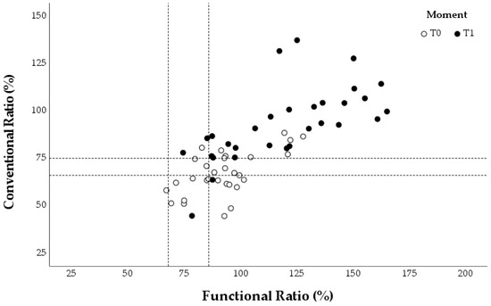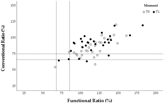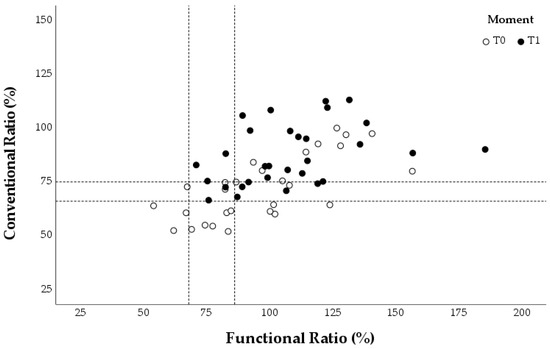 The concentric ER: concentric IR (conER:conIR) and eccentric ER: concentric IR (eccER:conIR) ratios were calculated for the different assessments at T0 and T1. Each swimmer provided three values for the conventional and functional ratios during each evaluation, corresponding to the three angular velocities tested. These individual values were plotted in three graphs for each group (Figure 5, Figure 6 and Figure 7), which also marked reference values for preventing shoulder injuries [9,22,24]. According to Ellenbecker and Davies [24], the optimal range for the conER:conIR ratio in swimmers is between 0.66 and 0.75. Regarding the eccER:conIR ratio, the optimal range is between 0.68 and 0.86, based on findings from Bak and Magnusson [22] and Drigny et al. [9].
