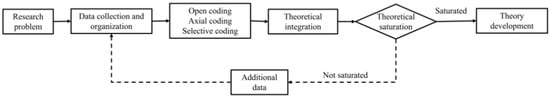 Grounded theory is one of the qualitative analysis methods, requiring researchers to fully utilize their theoretical acumen. Unlike traditional approaches, it does not begin with a theoretical hypothesis. Instead, data are collected from the real world based on research questions. The raw data are then abstracted and conceptualized, leading to the induction of a theoretical or conceptual framework. This approach is a classic bottom–up research method [32]. The process primarily involves three stages: open coding, axial coding, and selective coding (Figure 1).