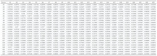 Based on the establishment of the initial direct relationship matrix , the column maximum method is used to normalize the direct relationship matrix. Specifically, the sum of the elements in each column is calculated to obtain the maximum value. Since there are cases where the sums of the elements in each column are equal, which may affect the calculation results, the sum of the elements in each corresponding column is compared with the sum of the elements in the corresponding row, and the smaller value is selected. Each element in matrix is then divided by the selected smaller value. The normalized direct relationship matrix is obtained by applying this process to the initial direct relationship matrix , as shown in Formula (2).