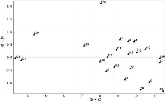 To visually depict the influence of each factor, the centrality values of the factors were plotted on the x-axis, while the causality values were plotted on the y-axis. The specific positions of each influencing factor in the coordinate system were marked according to their coordinates (Figure 3). In this figure, the factors above the X-axis are causal factors, totaling 11, while the factors below the X-axis are resultant factors, totaling 12.