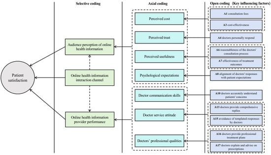 Third, selective coding further integrates and condenses the results of axial coding to reveal core categories, thereby focusing the analysis on the concepts and categories related to this core category. Through the analysis of the 23 categories and 12 main categories, this study summarizes patient satisfaction on the OMC platform into three core categories: audience perception of online health information, online health information provider performance, and online health information interaction channels.