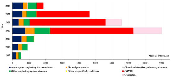 In Figure 1, the red segment—representing COVID-19—stands out as the most prominent, highlighting how the pandemic significantly affected absenteeism among medical staff. This finding aligns with Figure 1, which shows a sharp rise in sick leave days in 2020, followed by a slight drop afterward. By 2022–2023, COVID-19 cases had declined substantially, with the reduction in 2023 suggesting that we are adapting to the new public health landscape [38]. As shown in Figure 2, quarantine was an important factor during the pandemic. Even for non-symptomatic subjects, quarantine measures contributed to absenteeism, underscoring the importance of public health protocols [39]. Acute upper respiratory infections (dark blue in Figure 1) and other respiratory diseases (green in Figure 1) remained relatively stable throughout this period, suggesting these illnesses are a consistent cause of sick leave, even outside the pandemic. This finding reflects the consistent vulnerability of healthcare personnel to seasonal respiratory infections [40]. In 2020, there was a noticeable drop in cases of influenza and pneumonia (orange in Figure 1), likely thanks to the strict preventive measures put in place during the pandemic, such as wearing masks and practicing social distancing [37,41]. Published data supported that absenteeism due to respiratory infections could fluctuate due to changes in infection control practices [42]. On the other hand, chronic lung diseases (gray in Figure 1) or other unspecified respiratory conditions (yellow in Figure 1) continued to be a consistent reason for absenteeism [43].