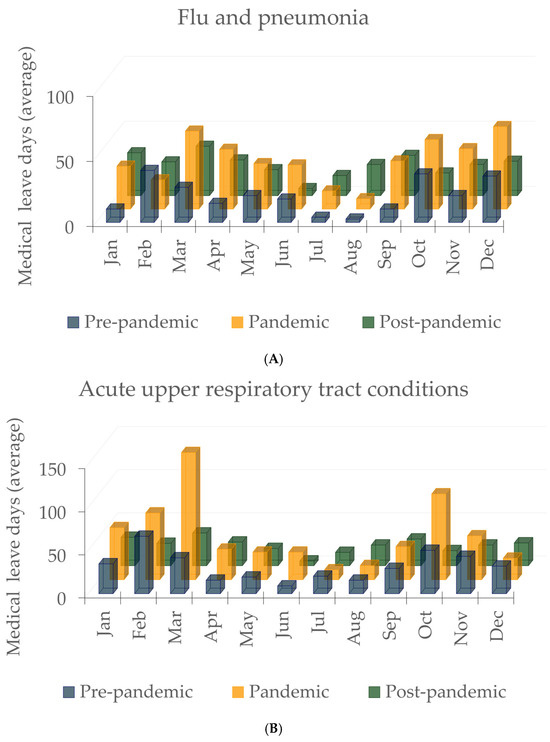 As demonstrated in Figure 2A,B, both influenza and pneumonia, as well as acute upper respiratory tract infections, exhibit a seasonal pattern, with a heightened number of cases observed during the colder months (January-March and October-December). This phenomenon can be attributed to the increased susceptibility to respiratory infections that occur during periods of low temperatures. During the pandemic, there was a significant increase in sick days for both categories, despite the implementation of restrictions, precautionary measures, and an overall increase in respiratory cases [46]. However, following the conclusion of the pandemic, the number of sick days decreased compared to the pandemic period, though it did not fully return to pre-pandemic levels. This trend suggests a lasting impact of the pandemic on respiratory health. While both categories were affected by the pandemic, notable differences emerged in the manifestation of the increase in cases. For instance, influenza and pneumonia exhibited more pronounced peaks in March-April and December, which are traditionally associated with the circulation of influenza viruses. This suggests that, despite preventive measures, influenza and pneumonia continued to affect the population, particularly in the high-incidence months. Acute upper respiratory tract infections, on the other hand, showed extreme increases in March and October. These spikes could be linked to successive waves of the SARS-CoV-2 virus and the spread of other respiratory viruses, which caused an increased need for sick leave [46,47].