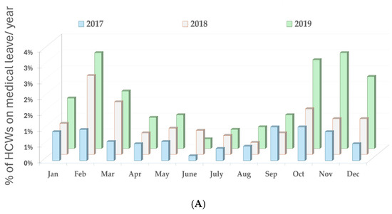As shown in Table 6, female HCWs, especially nurses, have the highest respiratory disease-related medical leave. This finding might reflect the hospital workforce structure or how demanding their roles are. The trends in sick leave days among HCWs, focusing on gender distribution, could differ in other countries, depending on HCWs’ access to paid sick leave [61].