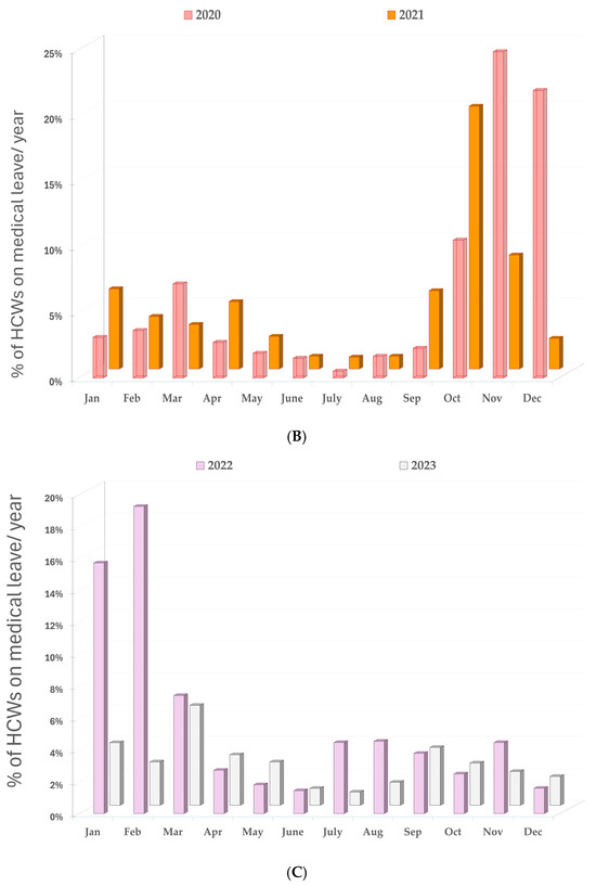 (A) Percentage of medical staff on sick leave by month and year before the COVID-19 pandemic. (B) Percentage of medical staff on sick leave per month and year during the COVID-19 pandemic. (C) Percentage of medical staff on sick leave per month and year after the COVID-19 pandemic.