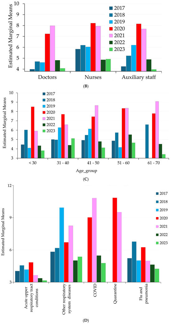Figure 4C shows the estimated marginal means of sick leave across different age groups over the years. The age groups below 30 (<30) and 61–70 years old consistently exhibit the lowest sick leave days across most years. Age group 41–50 exhibits the most significant increase in sick leave days during 2020 and 2021, reaching the highest levels among all age groups. For the age group 51–60, sick leave days are lower than for the 41–50 group.