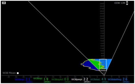 However, during eccentric contractions, calculating PTPmus (post-inspiratory) using traditional methods is challenging due to the absence of a temporal flow reference. This limitation may lead to an underestimation of PTP per minute and the work of breathing (WoB). To evaluate the load imposed on diaphragm fibers that elongate at the start of the expiratory phase, the Campbell diagram and partitioning of the Pdi–volume loop can be utilized (as shown in Figure 3). This work can be expressed in terms of negative work (J/L) [27] (Figure 3). However, employing this method requires specialized software and algorithms for real-time monitoring [25].