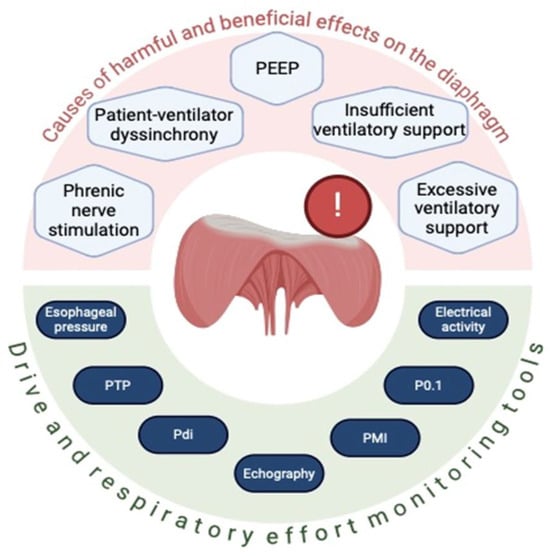 A reliable estimation of respiratory effort should be sought and appropriate adjustments to ventilator settings should be made to maintain adequate patient–ventilator interaction [33]. Tools such as esophageal pressure monitoring, diaphragmatic electrical activity assessment, ultrasound, and measurement of respiratory drive through P0.1 and ∆Pocc are useful for evaluating the magnitude of drive and inspiratory effort to optimize patient–ventilator interaction and avoid diaphragmatic dysfunction. The latter has been shown to be frequent in patients requiring mechanical ventilation and is associated with prolonged weaning, higher complication rates, and higher mortality. Esophageal pressure measurement provides a direct and accurate assessment of respiratory effort, while monitoring diaphragmatic electrical activity offers an indirect measure of respiratory drive [27,32,34]. Ultrasound can visualize the diaphragm and assess its structure and function [35,36], as well as help assess the interaction between the patient and ventilator [37] (Figure 5 and Table 1).