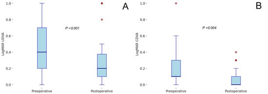 Table 2 presents the topographic and tomographic parameters before and after the procedure. Maximum keratometry exhibited a significant reduction, suggesting a flattening effect on the cornea. Maximum keratometry decreased by 1.14 ± 0.69 D. Corneal thickness parameters, including TCT and CCT, also showed a statistically significant decrease. The TCT decreased by 27.80 ± 10.89 µm, and the CCT decreased by 29.56 ± 21.87 µm.