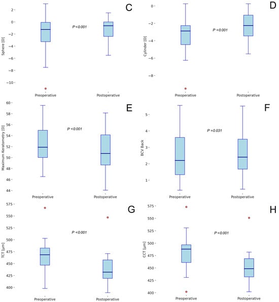 Box plots of preoperative and postoperative visual and corneal parameters. (A) Logarithm of the minimum angle of resolution (LogMAR) uncorrected distance visual acuity (UDVA), (B) logarithm of the minimum angle of resolution (LogMAR) corrected distance visual acuity (CDVA), (C) spherical refractive error (sphere, in diopters [D]), (D) cylindrical refractive error (cylinder, in diopters [D]), (E) maximum keratometry (max K, in diopters [D]), (F) back Baiocchi–Calossi–Versaci index (BCV back), (G) thinnest corneal thickness (TCT, in micrometers [µm]), and (H) central corneal thickness (CCT, in micrometers [µm]). Colored dots are outliers.