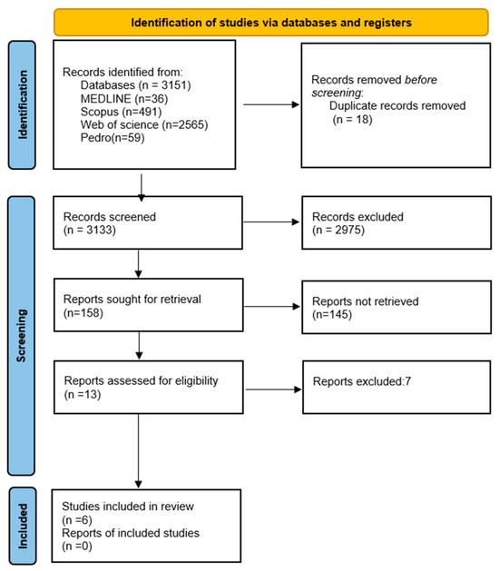 The search strategy yielded a total of 3151 studies. Of the 3151 articles initially identified in the databases, 18 were removed due to duplication. Out of these, 13 were considered for inclusion after review of title and abstract. Following full-text screening only six articles met the eligibility criteria (Figure 1).