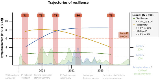 Trajectories of resilience among healthcare workers. All data and information pertain to Germany. Incidence rate and ICU bed occupancy rate are derived from the publicly available database of the Robert Koch Institute (www.rki.de). The cut-off value for the PHQ-4 is marked at 6 in the graph, with values above indicating major depressive and generalized anxiety disorder.
