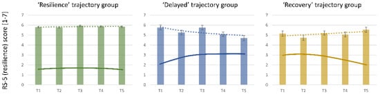 Given this statistical justification, we proceeded with the interpretation of the three identified resilience trajectories. These trajectories have been described before [19,20] and in this study were named in accordance with the literature (‘resilience’, ‘recovery’, and ‘delayed’). Figure 1 presents the three-class trajectories of resilience, measured by symptoms burden of anxiety and depression. The three classes can be characterized as follows: