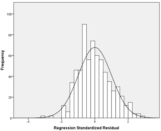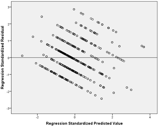 Our multivariable linear regression analysis showed that resilience and social support reduce nurses’ anxiety (Table 4). After adjustment for sex, age, educational level, work experience, and self-assessment of health status, we found a negative relationship between resilience and anxiety (adjusted standardized beta coefficient = −0.38; p < 0.001). Additionally, we found that significant others’ support is an independent preventive factor of anxiety (adjusted standardized beta coefficient = −0.27; p < 0.001). Considering the standardized beta coefficient, the impact of resilience on anxiety was higher than that of significant others’ support. The other two dimensions of social support (family and friends’ support) were statistically significant predictors of anxiety in the univariate models but were not in the final multivariable model. There were no multicollinearity issues since VIFs for independent variables were lower than the acceptable value of 5. Figure 1 indicates multivariable normality since the residuals followed the normal distribution. Figure 2 indicates the homoscedasticity and linearity of the multivariable model with anxiety as the dependent variable. We discovered similar findings regarding the impact of social support on anxiety and depressive symptoms. In particular, our multivariable linear regression model identified a negative relationship between resilience (adjusted standardized beta coefficient = −0.36; p < 0.001) and significant others’ support (adjusted standardized beta coefficient = −0.23; p < 0.001) and depressive symptoms. The standardized beta coefficient indicated that resilience has a greater impact on depressive symptoms than significant others’ support. Family and friends’ support were significant predictors of depressive symptoms in the univariate linear regression models, but this relationship was eliminated after the multivariable analysis. Table 5 shows linear regression models with depressive symptoms as the dependent variable. There were no multicollinearity issues since VIFs for independent variables were lower than the acceptable value of 5. Figure 3 indicates multivariable normality since the residuals followed the normal distribution. Figure 4 indicates the homoscedasticity and linearity of the multivariable model with depressive symptoms as the dependent variable.