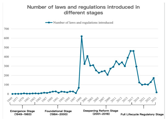 Drawing on the statistical data presented in Section 3.2, this section conducts a thematic analysis of legislative priorities and regulatory innovations across China’s four developmental stages, revealing how the legal frameworks evolved to address sector-specific challenges and align with socio-economic transformations.