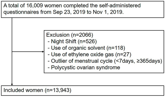 The exclusion criteria were strictly applied to exclude the influence of external drugs or occupational exposures that affect menstruation, including oral contraceptives, users of intrauterine devices (also known as loops), pregnant or breastfeeding women, night-shift workers, individuals exposed to organic solvents or ethylene oxide gas at the workplace, and individuals with polycystic ovary syndrome. Night-shift work can disrupt circadian rhythm and hormone secretion [30,31], whereas exposure to organic solvents affects the endocrine system, causing menstrual disorders [32,33,34,35,36], necessitating their exclusion. Among 16,009 participants, 671 were excluded owing to exposure to night shifts, organic solvents, or ethylene oxide gas. Further exclusions were made for extreme outliers, including menstrual cycle length of <7 days (n = 104) or >365 days (n = 7), and those with a history of polycystic ovary syndrome (n = 1284), leaving 13,943 participants who were included in the final analysis (Figure 1). In addition, the cases with missing values were excluded and we used only the data available for each analysis.