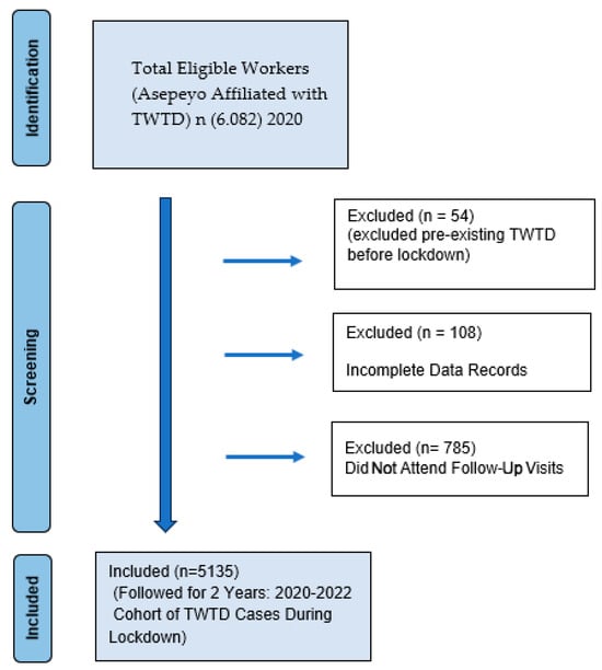 The target population consisted of all workers in Spain affiliated with Asepeyo who experienced temporary work disability due to mental health conditions during the COVID-19 pandemic and the subsequent two years. Workers were included if they had a temporary work disability due to commoncontingency and were diagnosed with a mental health disorder. The eligibility criteria required that the disability had been initiated during the official COVID-19 state of alarm (14 March 2020–21 June 2020) or in the following two years (2021–2022). All cases had to be managed by Mutual Collaborators with Social Security, with diagnoses coded according to the International Classification of Diseases, Tenth Revision (ICD-10) for mental health conditions. The study initially considered 6082 workers. To ensure data integrity and focus on COVID-19-related TWTD cases, workers were excluded if they had a pre-existing TWTD before the COVID-19 lockdown (n = 54), had insufficient data to be included in the study (n = 108), or did not attend follow-up assessments (either telephone or in-person) (n = 785). After applying these exclusion criteria, the final sample consisted of 5135 workers, followed over two years (2021–2022) to analyze new TWTD cases, relapses of mental health-related TWTD, economic burden, and workdays lost.