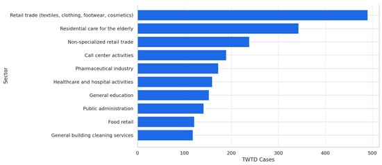 Additional sectors with a significant TWTD burden included the pharmaceutical industry (172 cases), healthcare and hospital activities (159 cases), general education (152 cases), public administration (141 cases), and general building cleaning services (118 cases).