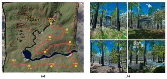 (a) Virtual forest map with 8 checkpoints marked in yellow, along with the red path the participants must follow; (b) screenshots of the virtual forest.