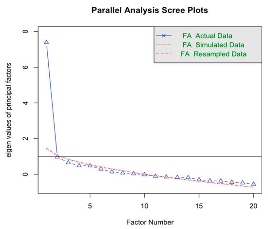 We conducted a factor analysis to identify the underlying constructs for the 20-item Social Interaction Anxiety Scale (SIAS). The KMO measure was 0.82, indicating sampling adequacy. Bartlett’s test of sphericity was significant, χ2(190) = 569.63, p < 0.001, suggesting the factorability of the correlation matrix. The scree plot suggested only one factor (Figure 2). Varimax rotation was applied to achieve a clearer structure. Table 2 shows the factor loadings of the 20 items, in which Item 14, “I have difficulty talking to people I am attracted to”, had the lowest loading with 0.184, suggesting a poor contribution to the factor. All the other loadings were above 0.3.