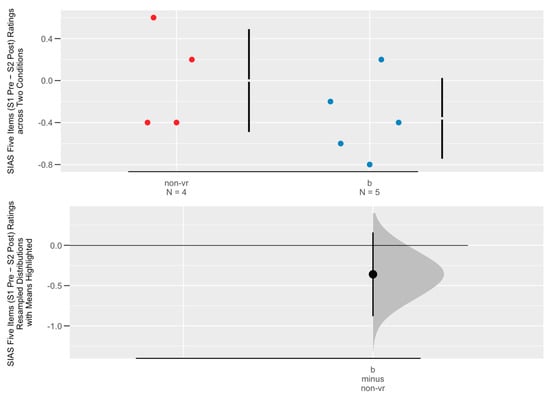 The nine participants (five in the combined condition and four in the Non-VR condition) who stayed in both sessions (only participants in Conditions B and Non-VR returned for the second session) were too few for statistical analysis. However, the corresponding Cumming plot in Figure 4 again shows a tendency for Non-VR (i.e., therapy only) participants to report a greater drop in social anxiety (vs. the combined condition).