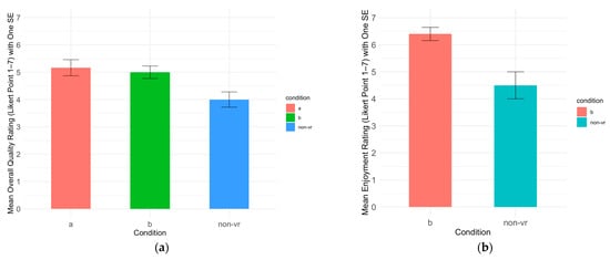 In addition to analyzing social anxiety, we conducted a Fisher’s exact test to evaluate differences in quiz accuracies across two conditions (B and Non-VR) in three checkpoints to further assess participant’s understanding of the therapy instructions. User experience was assessed using one-way ANOVA and post hoc Tukey tests, comparing overall quality and enjoyment ratings (from the Virtual Reality Neuroscience Questionnaire (VRNQ)) across conditions. To examine restoration outcomes, a mixed ANOVA was conducted to assess the effects of conditions and phases on restoration ratings (calculated as the average of the six items from the Restoration Outcome Scale).