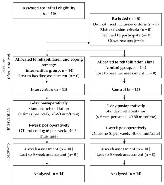 The study population consisted of 36 women aged over 60 years who had undergone unilateral TKA at the Fukuoka Rehabilitation Hospital and had been diagnosed with knee osteoarthritis. Of these, 28 patients were included in this study after excluding those who (1) had psychiatric or neurological conditions, (2) self-reported a diagnosis of inflammatory arthritis, or (3) were scheduled for high tibial osteotomy for conditions other than knee osteoarthritis (Figure 1). Fourteen patients were assigned to the control group that received OT without coping strategies from January to December 2021, while the remaining fourteen were assigned to the intervention group which received OT with coping strategies from January to December 2022.