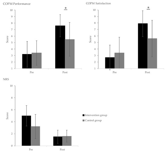 Figure 3. Multiple comparisons of intervention and control groups. Note. COPM, Canadian Occupational Performance Measure; NRS, Numerical Rating Scale; and CI, confidence interval. (*) A significant difference between groups was observed in the post-intervention results at two weeks (p < 0.05).