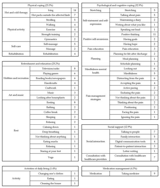 Early-postoperative coping strategies were categorized into six groups: physical coping, psychological and cognitive coping, social support, refreshment and relaxation, activities of daily living, and medication management. Prior studies have identified analgesics (78%), exercise (35%), and cognitive methods (37%) as the most commonly used coping strategies for chronic pain [37]. Other studies have reported the use of medication (73%), exercise (33%), and cognitive strategies, including distraction (31%) [38]. Recent studies have highlighted the process by which different attitudes and beliefs lead to changes in daily life and activities when coping with chronic pain, noting that this process requires self-involvement and is influenced by demographic characteristics, physical factors, psychosocial factors, and self-knowledge about one’s condition and coping strategies [16]. Furthermore, coping strategies for patients with high preoperative anxiety include conversations with healthcare professionals [39]. The current study also included these elements as characteristics of early-postoperative coping strategies (Table 3).