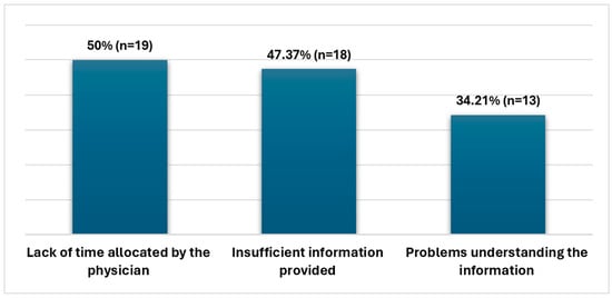 The most commonly reported communication difficulty was the limited time allocated by the physician. Insufficient information provided by the physician was identified as the second most frequent communication barrier. Additionally, a significant proportion of participants experienced challenges in understanding the information provided. Participants were able to select multiple responses for this question (Figure 2).