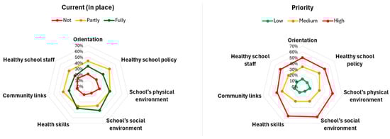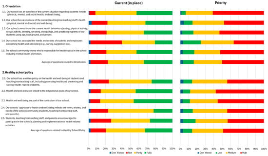 With respect to the questions related to orientation in the SHE rapid assessment tool, almost all points were reported as either totally or partially currently in place, except for Question 1.4. In this question, respondents were asked whether the school has evaluated the needs and desires of the students and staff regarding health and well-being. Over one-third indicated that this aspect was not currently achieved. In terms of priority, almost all points were considered high priority in 50% or more of the cases, with 25–30% of the points being considered medium priority (Figure 1).