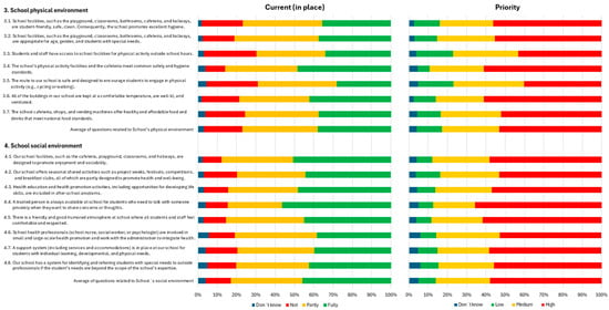 With respect to the questions related to the schools’ physical environment, many points were reported as either totally or partially currently in place in approximately 75% of the cases. However, in more than 25% of the cases, the questions related to students and staff having access to school facilities for physical activity outside of school hours and the safety and design of the route to the school to encourage students to engage in physical activity were not in place. In terms of priority, almost all points were considered medium or high priority in more than 80% of the cases (Figure 2).
