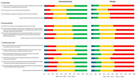 Concerning the questions related to the schools’ social environment, in nearly 50% of the cases, the majority of points were reported to be fully in place. Similarly, in terms of priority, all points were considered high priority in more than 50% of the cases (Figure 2).
