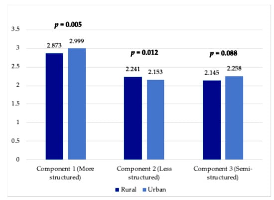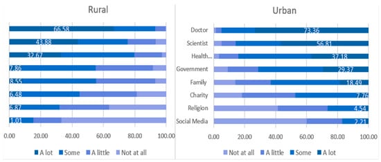 There are significant rural–urban differences by component (Figure 2). Figure 2 used the mean score of their trust levels (from 1 = not trust at all to 4 = trust a lot) and used dark blue to present rural respondents’ scores while light blue for urban respondents. Urban respondents are more likely to trust information from doctor, charity, government, and scientist (2.999 > 2.873, p = 0.005), but rural respondents are more likely to trust information from family and religion (2.241 > 2.153, p = 0.012). Although urban respondents have a higher confidence level in social media and health systems than rural respondents, the difference is not statistically significant (2.258 > 2.145, p = 0.088).